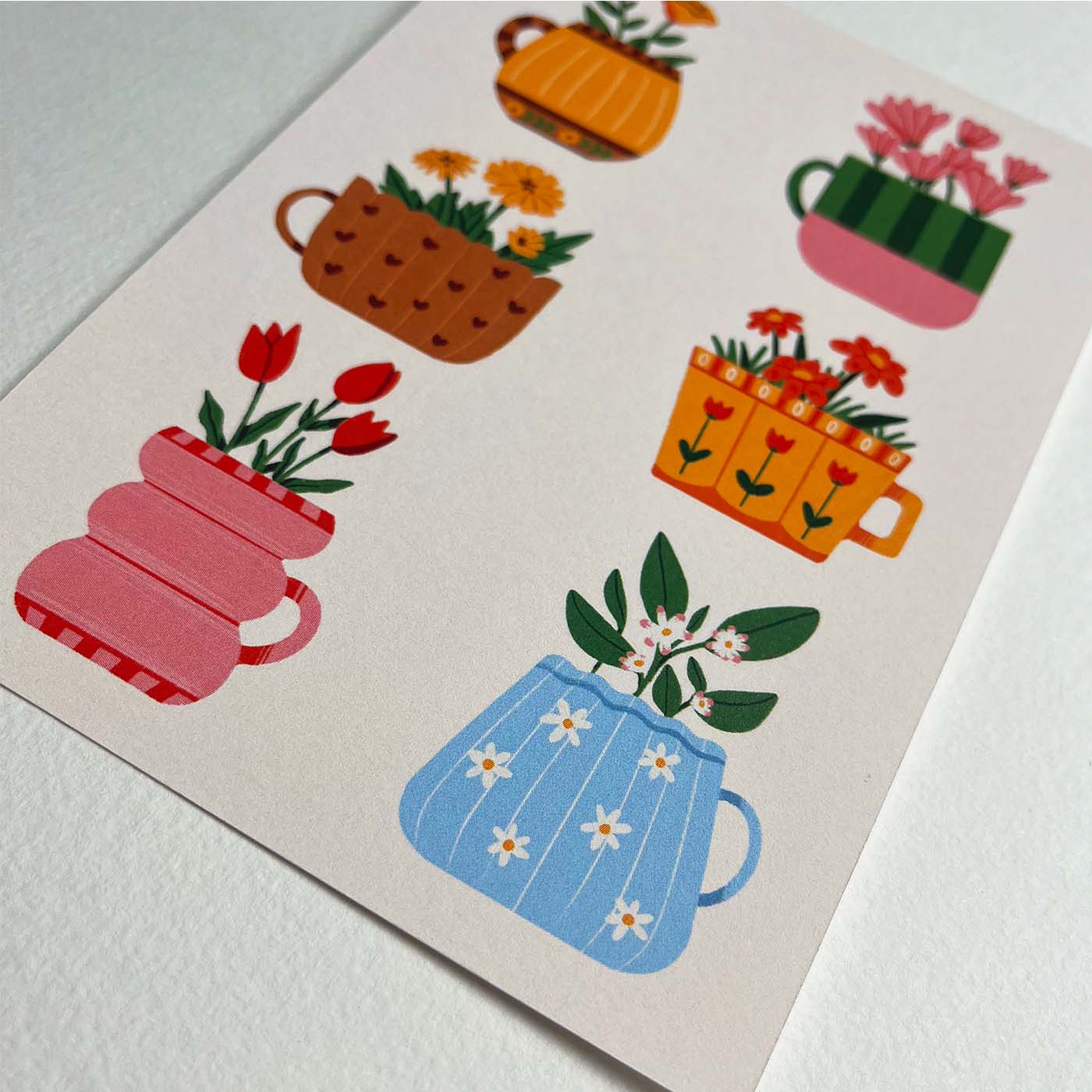 Parfois, de drôles de choses poussent dans nos tasses préférées. Ici, fleurs et plantes se répandent dans ce petit objet du quotidien, pour apporter une touche de gaieté et de douceur colorée.