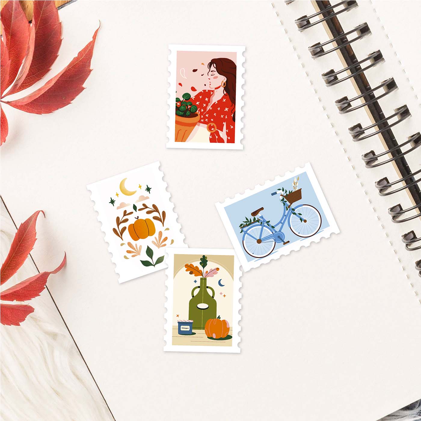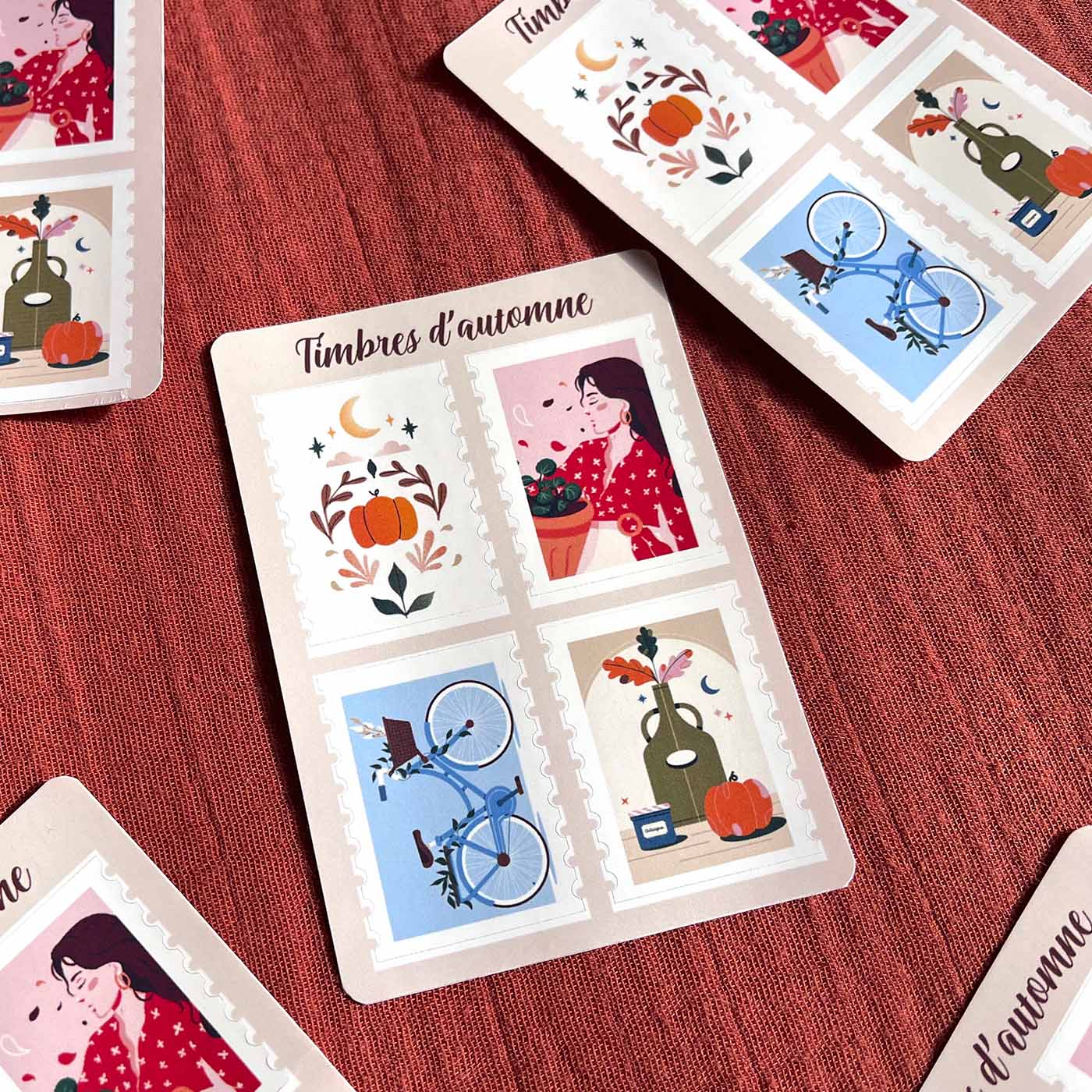 Ajoutez une touche automnale à votre quotidien et vos projets avec cette planche de 4 stickers timbres illustrés. Parfait pour décorer votre ordinateur, un bullet journal, un carnet, une gourde … ou tout autre support.