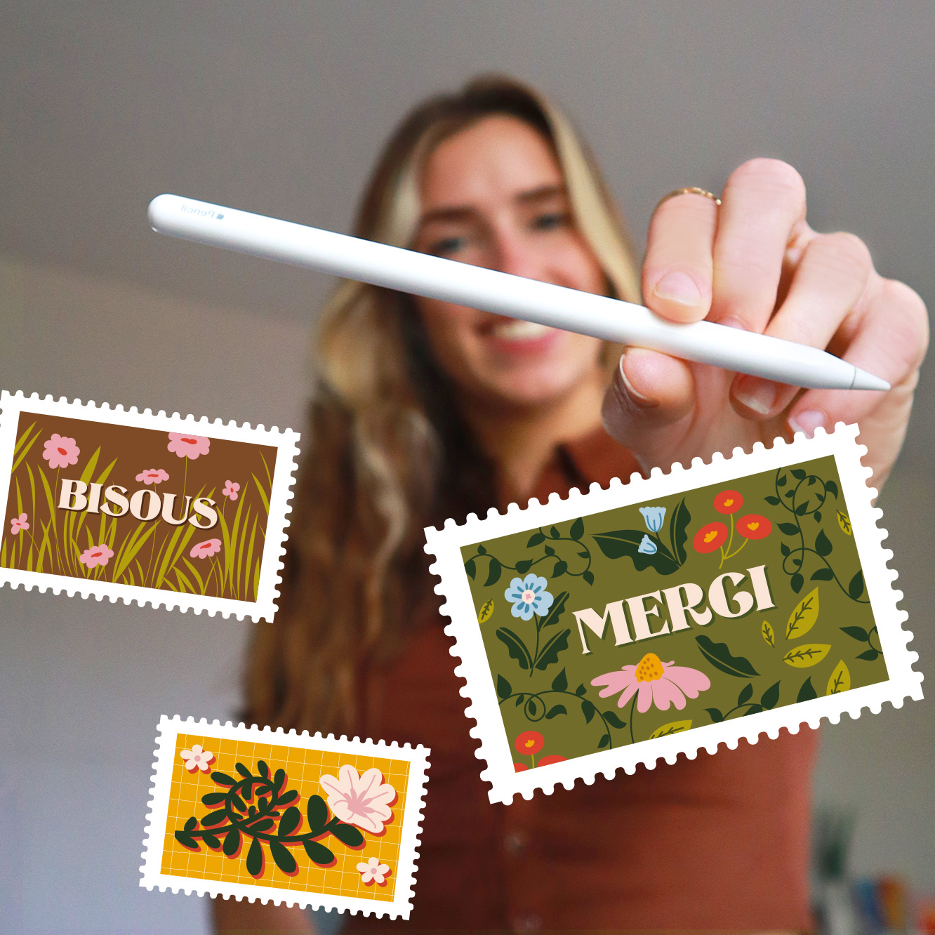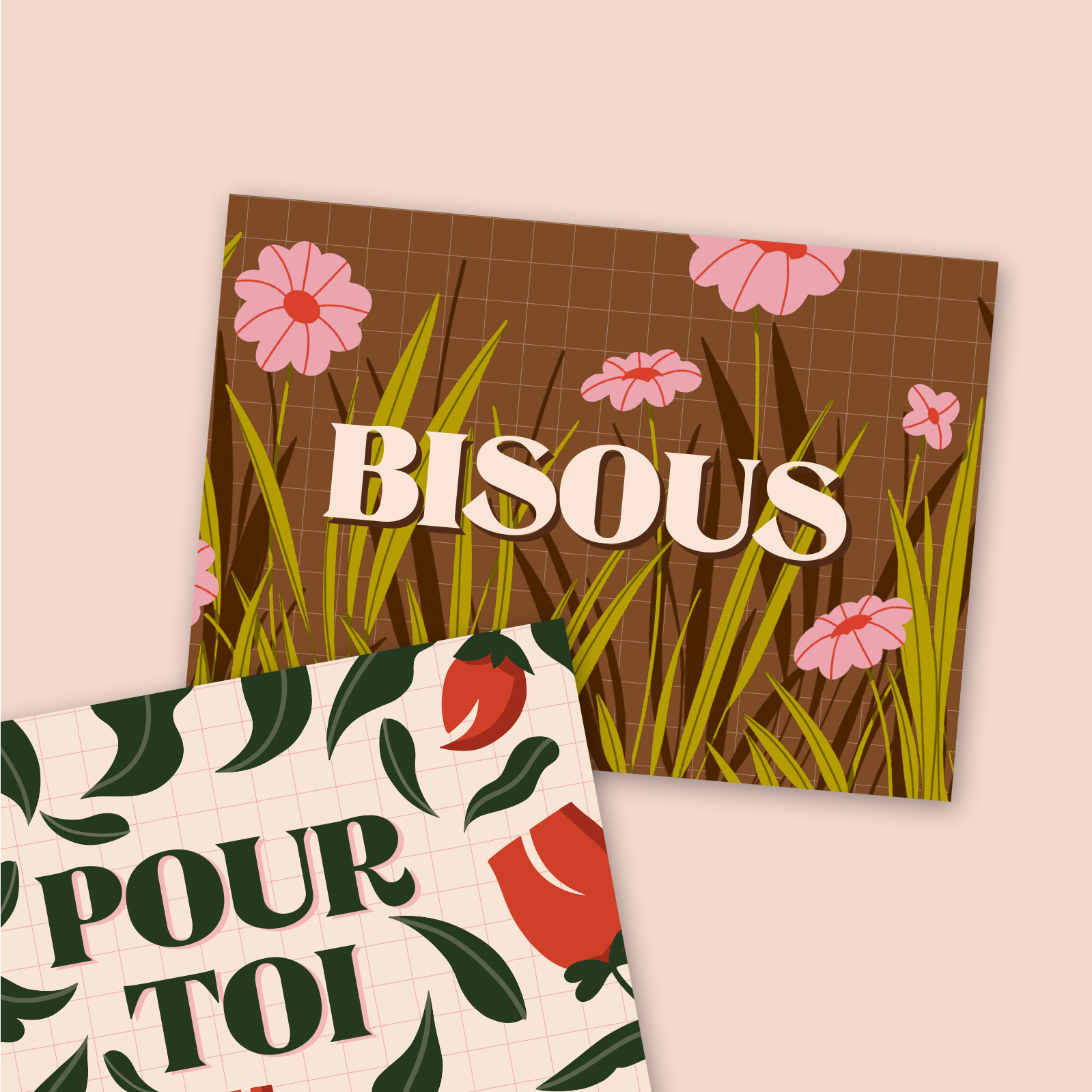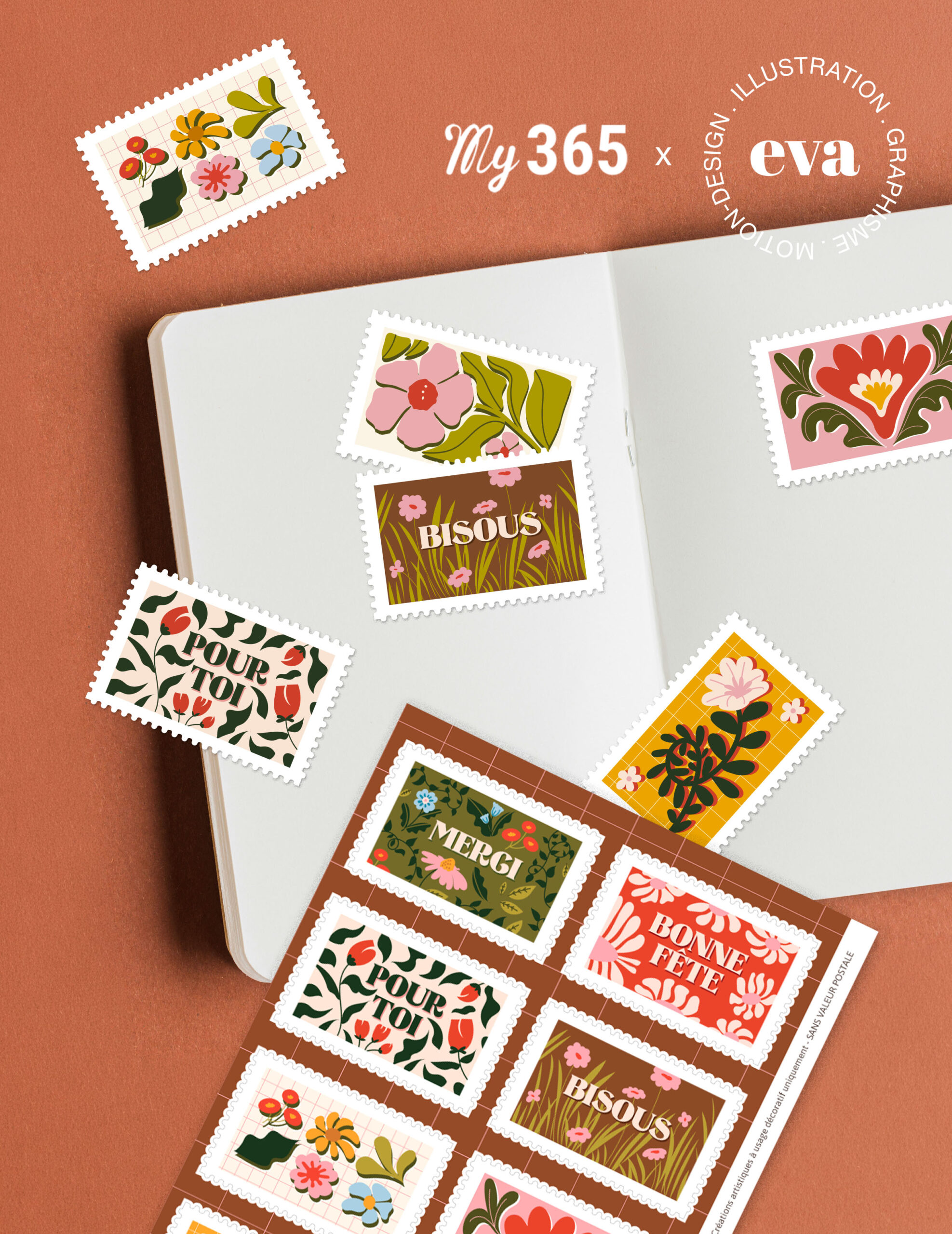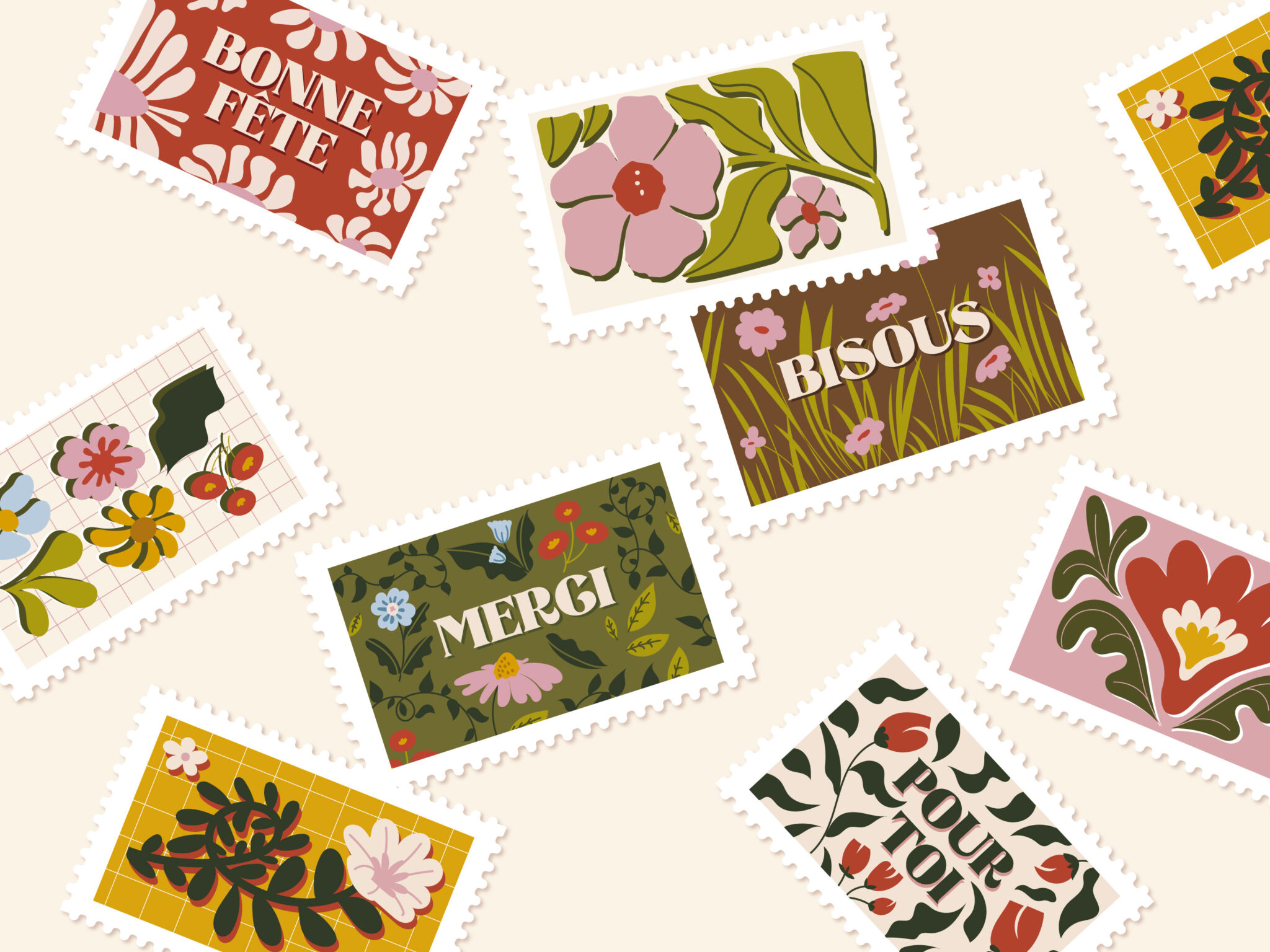 Une collaboration illustrée qui a permis de travailler sur un support aussi marquant qu’intemporel : les timbres, sous forme de stickers. Seuls ou composés autour de titrages, les éléments végétaux illustrés apportent une touche colorée pour correspondre à toutes occasions. Visuels également disponibles en cartes postales sur le shop.